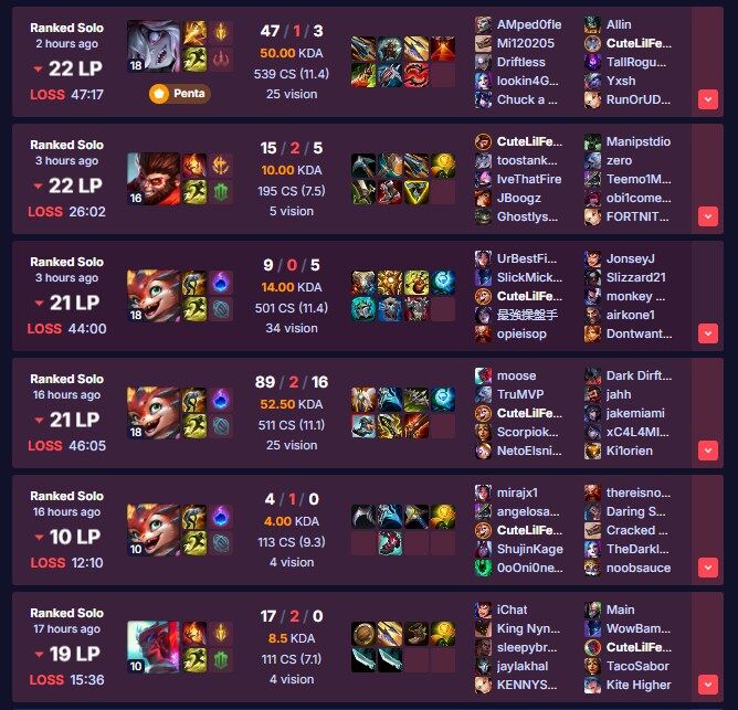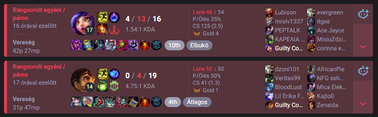 Ő kda összege kb 12 a 8 mérkőzésen, az én kda összegem kb 58.Nem is folytatom nevetséges a különbség, én így játszanék akkor hát nem is tudom kb bronzban lennék. Elmúlt 8 meccsen 4 alkalommal voltam ace, tudom nem számít, de hogy a fenébe nem csúszik be egy győzelem sem? Milioval ászolom a meccseket nevetséges, ennyire nem csinál semmit senki más a pályán....csak halnak számolatlanul. A 10. percre általában már ilyen 0-8-ban van a csapatunk, nem értem.