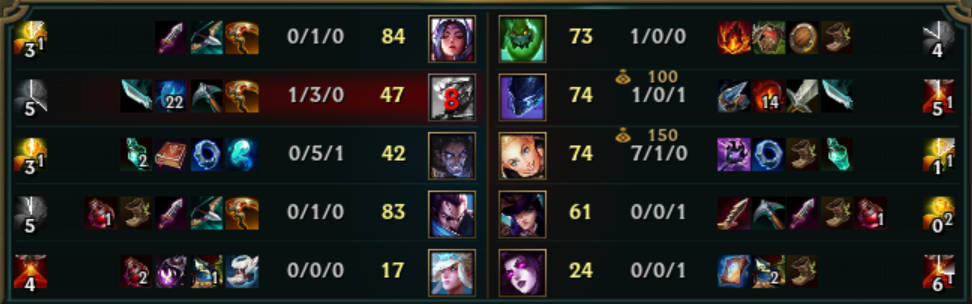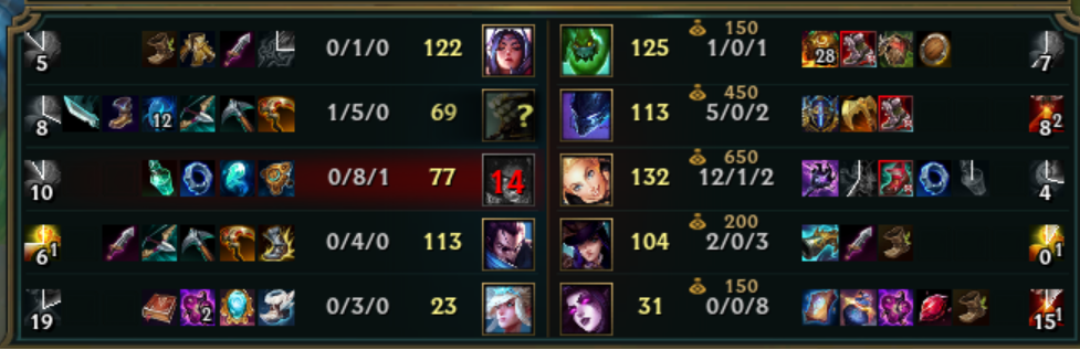 12 percig konkrétan semmi sem történt a laneteken, majd (gondolom) mikor groupoltatok, vagy roamolt a lux, kaptál pár assistot, ezért a magas pontszám, de ha gondolod küldd el a vodot, és megnézhetjük.Még1x és utoljára (tényleg utoljára): nem azért szívják a véred itt, mert rosszul játszol, hanem mert olyan dolgokról írsz novellákat, amik objektívan nézve nem úgy vannak a játékban, ahogy azt te gondolod. Plusz mióta beütötted a platot szerintem kicsit sok lett a "tanító jellegű" ötletelés..