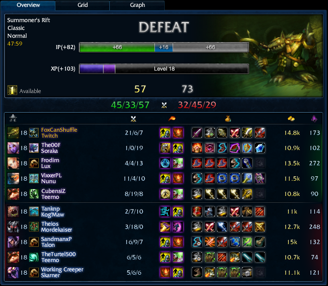 For a loss, the reward is approximately: 16 IP + 1.405 per minute IP.[1]Ugy tunik igen.