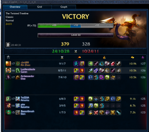 Tegnap hasonlóan kaptunk ki, végig jobbak voltunk, de nem vártak meg és belementek egy teamfightba a második mides tornyunk alatt, mire odaértem. Ketten meg már semmit se tudtunk tenni, úgy jöttek át mint kés a vajon. Az egy másik dolog, hogy 4/4/10-zzel végeztem Katarinával