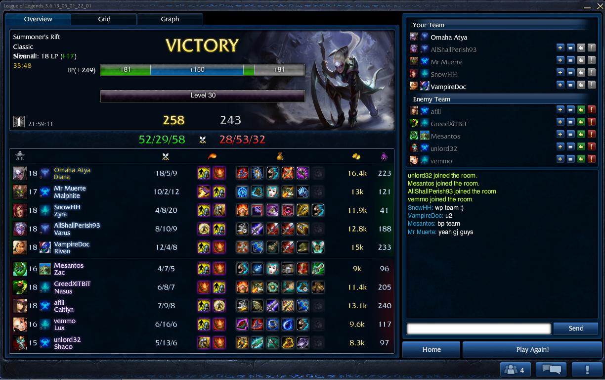 Igen van DoT-ja, de mivel ultival ellőttem a falnak Lee-t, így a DoT hozzá se érhetett, szerintem az E-je volt, de mindegy is. Amikor az egyik csapattársam quadra killnél tartott, én Varussal álltam és nyomogattam folyamatosan az S betűt, hogy ne támadjam az utolsót, így övé lett a penta. Vagy csak én gondolom, hogy ilyenkor illik odaadni?Csak úgy örülnék már ha egyszer összejönne, még csak egy unnofficial pentám volt Pantheonnal.