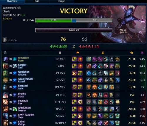 Egyszerűen már szánalmas, hogy ha nem bannolják Shent kis szinten, akkor valaki kiválasztja, mindegy, hogy tud-e vele játszani vagy nem. 12/3/9-be végeztem úgy, hogy 1 dmg-es itemem nem volt és én voltam a top 1 dmg a játékban. 2x haltam még 6-os szint előtt, 1x a lvl 2-es Volibear gank miatt, 1x meg mert bediveoltam Volit és Shent 1 dupla killért