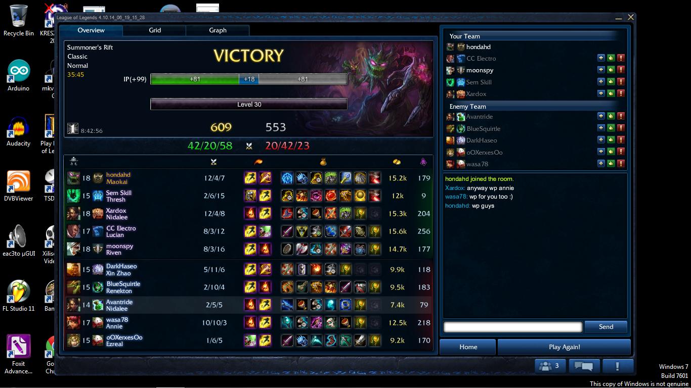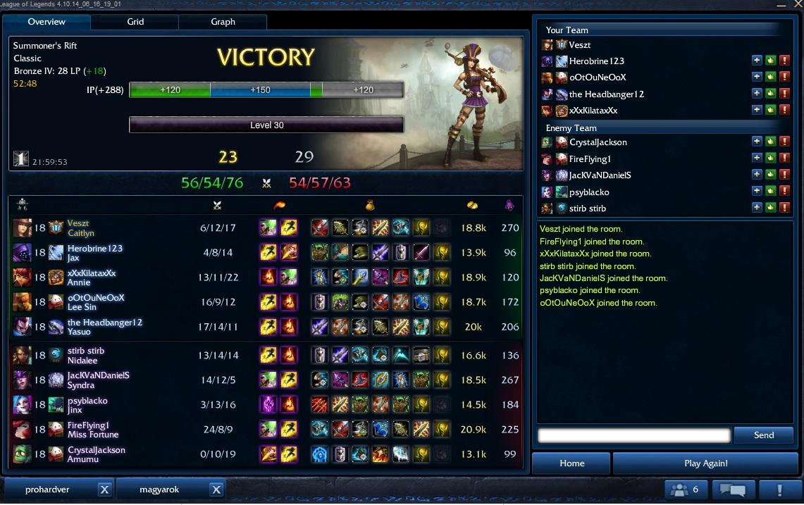 Elvileg most azért kaptam egy reportot, mert elfeedelték Katarinát és ugye én voltam mid. De nem én feedeltem el, az első negyed órában meg se haltam, onnanstól kezdődtem a teamfightok, de addigra Katarinának már volt öt killje, defensive item meg ugye luxus...