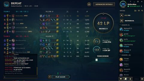 Troll, afk ...stb. Sőt az előző szezon végén amikor szinte csak goldosokkal játszottam már... hát azt kell hogy mondjam, ugyanaz a hozzáállás: valami nem tetszik neki, afk, valaki feedel, toxic, ugyanúgy megy a chat, ahelyett, hogy újraterveznének, vagy figyelnének a játékra, arra, hogy mit épít az ellenfél, és ha kell mr-t vásároljon