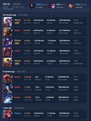 10/8 meccsen lehoztak, és nem a szerencsétől függ. Kipróbáltam már a Cait-et, nem kell hozzá nagy tudás, csak én nem kapok hypercarry csapatot.... pech... Van, akinek bejön, van akinek marad az Iron. Hogy honnan tudom? Végignéztem a meccseidet, nálad nincsenek érdekes módon 1/10-es emberkék, mindenki tudja a dolgát, illetve 50%-ot nem éri el a KP-d, tehát lanefázisban eldőlt a legtöbb meccs. Már vért hugyozom, hogy solo-ban lehozzam, de kevés vagyok.