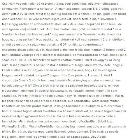 Ez tényleg csak frusztráció levezetésre volt jó, ellenben ezzel a hozzáállással (ha nem változott) sok jóra ne számíts jövőben se. Mindenki úgy játszik ahogy akar amúgy, de én azt mondom nem tudod kezelni a többi játékost, így nálad (is) van hiba. Magadon, a saját hozzáállásodon tudsz változtatni, tudsz fejlődni, a többi játékosén nem. Akkor mi a teendő? Őket szidni, vagy magadba szállni, és kikapcsolni a chat-et, ignorálni a többi játékost? -