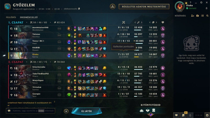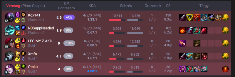 Az OP.GG pontszám szerintem elég jól mutatja kb a teljesítményt, akkor kezdek el azon gondolkozni, hogy ludas voltam a vereségben, ha alacsonyabb a pontszámom, mint a csapatom többi tagjának. Itt mindkét szóbanforgó meccsen a 2. legjobb pontszámot kaptam csapaton belül. De többnyire ez is szokott lenni, ilyen szempontból ezek jó példák, és amit írtam is már sokszor, hogy persze ritkán vagyok MVP, de sokszor vagyok ilyen 2.-3. és szintén ritkán vagyok a csapat 2 leggyengébbikéből valamelyik.