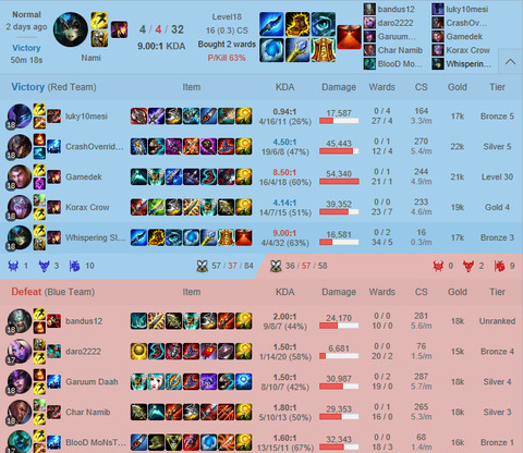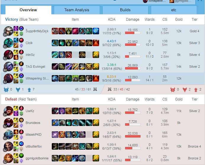 Itt van példának ez a Normál meccs: [link]. Zed írta, hogy mid, Twitch adc, Irelia top én me supp. Erre az utolsó gyerek bepickelt egy Dariust és instalock. Irelia ír neki, hogy tesó top van jungle kéne. Gyerek a meccs kezdés előtti utolsó 5 másodpercig nem írt semmit, majd beírja, hogy premade bot és supportolni fog. Irelianak még maradt annyi ideje, hogy átváltson smite-ra, meg a rúna és mastery page beállításait. Én meg mentem support rúnákkal, meg mastery-kkel topra Camille ellen. Ehhez képest simán lehoztam, eléggé lehet counterelni a rugólábú bigét Branddel.