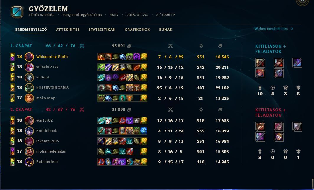 Jogos, megint indokolatlanul sok lett a sírás. Ellenben az új kliensben ez a gyors meccs visszanézési mód nagyon baba. Előbb néztem vissza egy meccset, amit bár lehoztam Branddel (15/1/9), de így is találtam 5 hibát amit vétettem: