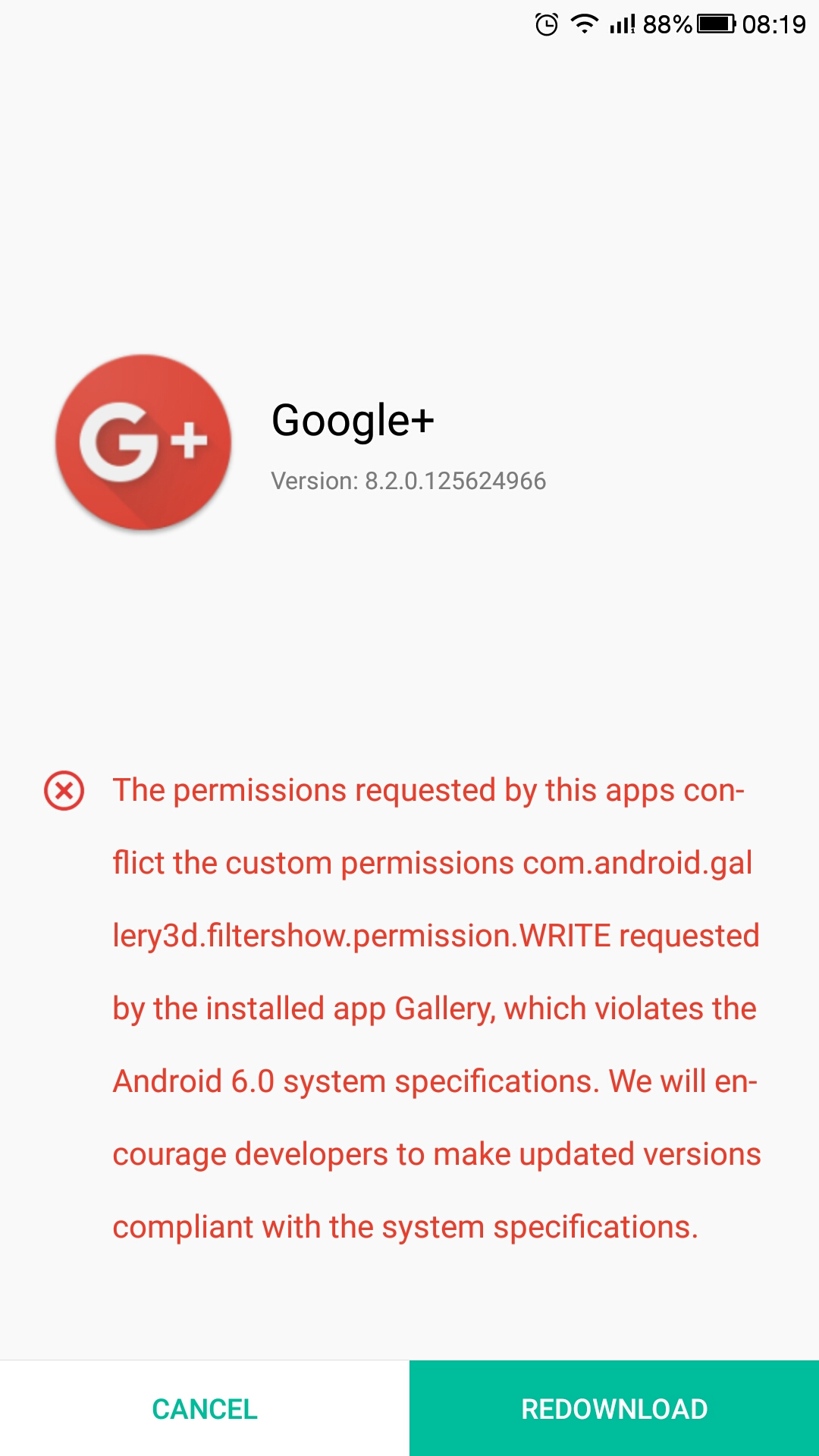 "The problem is the signature of the gallery system app. Both apps use the same and with Android 5 and above it´s not possible to install 2 Apps with same signature. You cant install Google+ via PlayStore or from storage. Only way is to manualy integrate the App with an Root-Explorer..."