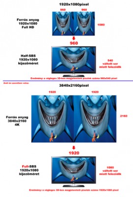 "A half SBS nem azt jelenti, hogy vízszintesen csak 2x960 képpont a felbontás. Ezek a képek tömörítve vannak. Az 1920 pixelt betömöríti 960-ba, amit a TV visszaállít 1920-ra. (zsugorítás-nyújtás)."
