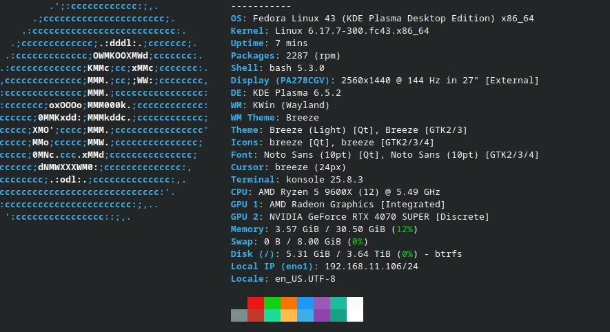 Fedora 43 lett a választásom, hivatalos release-t kerestem végül. ugynaúgy KDE. elsőre úgy tűnt, hogy hibátlan, minden alapfunkció ment, a 144Hz is rendben, nincs akadás. nVida driverek nincsenek még telepítve.