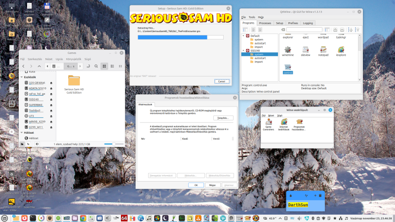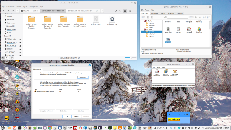 Q4Wine-->SSD240 prefix-->system-->control-->Wine vezérlőpult-->Programok hozzáadása-->Telepítés--->telepítő EXE betallózása.