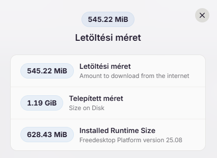 Most gondoltam kipróbálok egy másik rendszert (openSUSE Tumbleweed) , hátha ott nem skálázódnak rosszul az ablakok - másznak el az ikonok stb. Friss telepítés, feltettem pár dolgot flatpak csomagként (beletörődtem, mert ott még a LibreOffice is csak úgy települ alapból, hurrá) , na mondom akkor Videóletöltő. Azt hazudja, hogy 149MB helyet foglal majd. Megnéztem du-val telepítés előtt és után: 1,8GB-ot foglal úgy, hogy ugye már volt előtte telepítve néhány flatpak-es cucc. Ő sem túl igazmondó ;-)