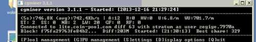 Running command: "C:\cgminer\guiminer-scrypt_win32_binaries_v0.04\cgminer\cgminer.exe" --scrypt -u xxxxxxx -p xxxxx -o stratum+tcp://world.wemineltc.com:3333 --gpu-platform 1 -d 0 -w 256 -v 1 -I 13 -g 1 -l 1 -T --thread-concurrency 1024