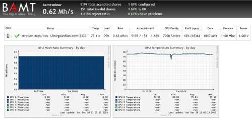 "kernel-path" : "/usr/local/bin"Eredmény atomstabilan akár a világvégéig, 75 fokon, 40% fan RPM, 620 KHS. Nekem ettől több nem kell egy 7950 estől, sőt a többit csak 600 on járatom :