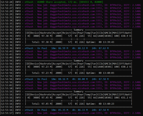 Az kártya overclock és a reject között eddig nem találtatok szoros összefügést ugye?Én más pool európai szerverét használolm 30-40 ms a ping és 0 db rejected, biztonságos tuning beállításokkal (97MH/s).