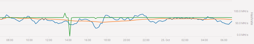 Az normális jelenség, hogy a reported hashrate (zöld) alatt van az average hashrate (narancs), elég ritka h a zöld fölé menjen a narancs.