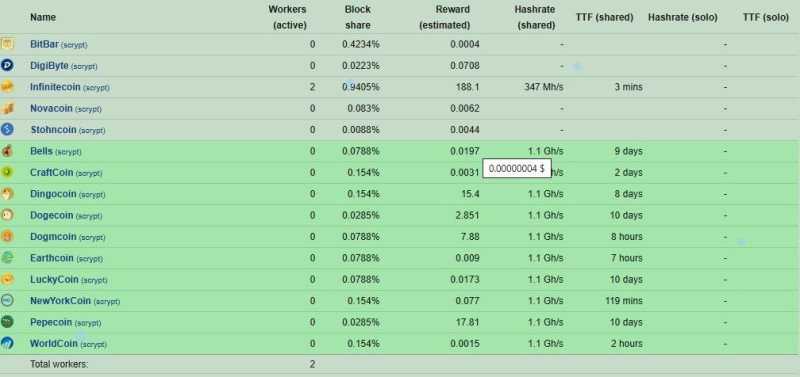 Ha talál a pool blokkot, akkor az addig beküldött találataid arányában az összes beküldötthöz képest kapsz jutalmat. Itt az egyik oszlopban százalékos bontásban mutatja a részvételed, illetve hogy mennyi jutalmat kaptál. A TTF pedig azt mutatja, hogy egy blokk megtalálásához a poolnak mennyit kell dolgoznia elméletileg, a pillanatnyi hashrátából számolva. Ez változhat ha jönnek vagy mennek a bányászok.
