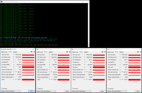 Megpróbáltam összerakni a pool teszt gépet, de szerintem az X99-nek nem az erőssége a riser-es móka. A harmadik slotban például fel sem ismeri a Windows a VGA-t. Olyan, mintha nem is lenne bekötve. Most négy kártya megy benne, az egyes, kettes, négyes, és ötös slotokban. Ráadásul a harmadik kártya hash értéke néha beesik 10%-ot. Szóval ezzel a rendszerrel nem lehetne hiteles teszet végezni. Majd ma este hazahozom a Z97-es konfigot, amiben biztosan működik hat kártya. Mutatok egy képet, hogy dolgoznak. Valóban szép kis peak-ek vannak.