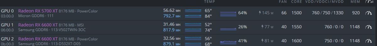 azthiszem megvan a gond.az egyik gépben, amiben 6800xt(63mh) és 6600xt(32,5mh) vannak trm szerint a current hash és az avg stimmel, viszont a poolnak jelentett az 38-40mh/kártya, ami az egyiknél nagyon kevés a másik tipusnál meg sok....