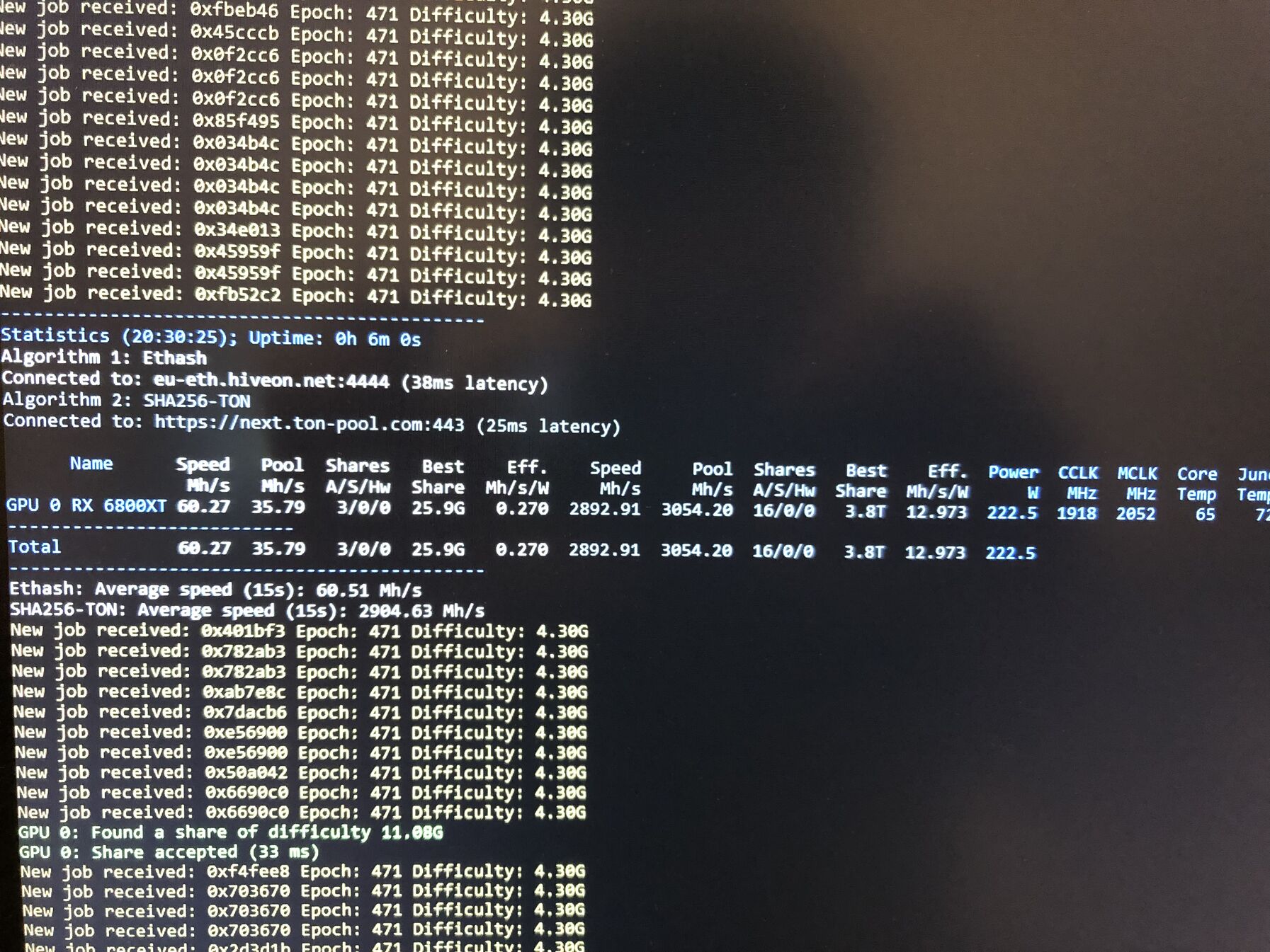 Nekem a 6800xt 3.45GH-t termel, azonos fesz es kicsit nagyobb orajel mellett.5.5GH kell kb napi 1 ton-hoz.