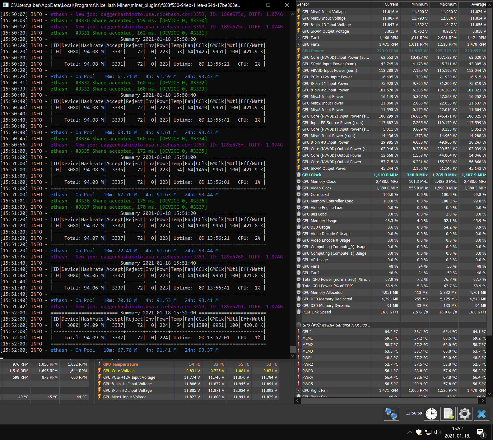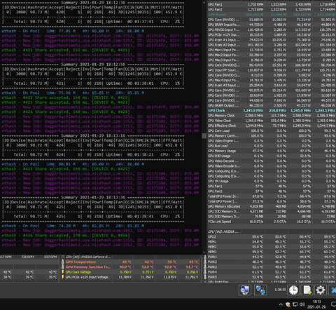 Nem terheli le nagyon, de esik a hashrate ha bármit csinál az ember. Már ha tálcáról megnyitom a minert, meg hwinfot akkor megnyitás pillanatában nagyobbat de utána is 0.5-1 MH/s mínusz folyamatosan.