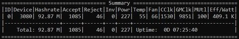 Teljesen alapon is csinálta OC vagy UV nélkül bődületes fogyasztás mellett.Most is megy 3 órája (@0.825V 1500 MHz +600mem) és 400/11 accept/reject. Azaz 2.75%. Így 222W és 92-93 MH/s. 55 fok GPU, 59-64 fok VRAM, 65% fan.