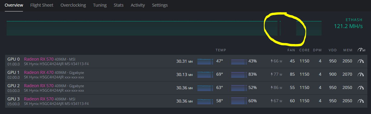 HiveOS, HiveOn pool, Phoenix miner. 3 db, hónapok óta atomstabil rig egymástól függetlenül, percre pontosan dobta kétszer is a phoenixminer reboot-ot.. -