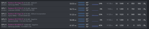 Az alapanyag a Drobi fele 36cm szeles rig volt, ami elvben 4 kartyara van meretezve, illetve alulra a lapba kerult egy 5.Az 5 kartya kicsit szedett-vedett modon jott ossze: 2db rx 590 nitro+ se (ez legalabb jol nez ki, jo a hutese, es jol is huzhato), 2db Vega es egy 5700 XT.