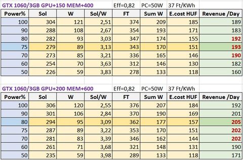 Áram 37 Ft/Kwh. // Táp 0,82% // Gép fogyasztása 50W //1 Mh/s => 20 Ft/nap1 db 1060/3GB (samsung): 23,5 Mh/s 73W // Ár 73.000