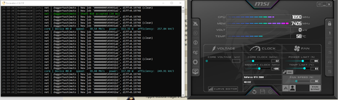 20210316 21:42:06 GPU #2: Gigabyte RTX 3070 - 61.51 MH/s, [T:37C, P:121W, F:72%, E:513kH/W], 12/12 R:0%Az ehhez tartozó beállítások (precision x1):