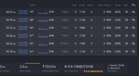A claymore-t használtam, 6 kártyával (Polaris BIOS MODDED) az OverdriveNtool-al. 1 kártyát (SAPPHIRE) eltávolítottam, így 5 kártyával jól működött, mindegyik elérte a 30-31 Mh / s sebességet. Később a Phoenix minerra áttértem és a 20.11.2 illesztőprogramhoz raktam fel hozzá, OverdriveNtool-al húztam az értékeket.Most újra szerettem volna telepíteni a 6. kártyát.(eddig csak a claymore alatt ment mind a 6)