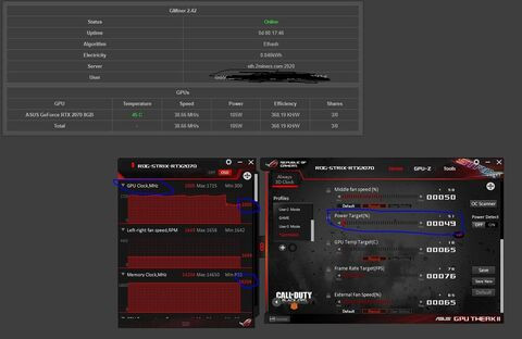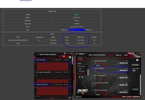 Helló! Asus RTX 2070OC kártyával bányászok. Az volna kérdésem, hogy a két kép alapján melyik a jobb beállítás. Meg mért van az, hogy hiába engedem feljebb a power limitet a heshrate nem nő.