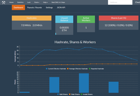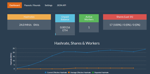 Hála a segítségnek ki tudtam próbálni, hogy (egyelőre mindenféle finomhangolás nélkül) egyetlen Asus Strix GTX 1060-as az ethermine.org poolt használva mit produkál a gyakorlatban, a pool webes statisztikái szerint. Bő 2 óra futás alapján 24 MH / s jött ki, és 0.00116 ETH volt az unpaid balance.