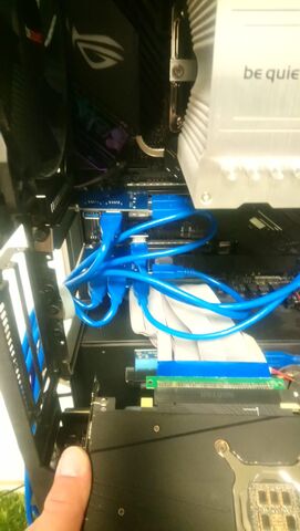 Igen, ez az a ház. Egyszerűen nem fér el máshogy. Az alsó a házhoz adott adapterbe van fogatva egy riserrel+ hosszabító kábellel ( a riser a második MB helyére csavarokkal van rögzítve). A felső egy PCI hosszabbítóval van a ház gyári keretébe fogatva.