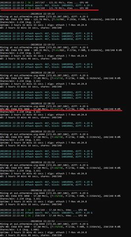 Adott egy FTW Ultra 3090, ami idáig megfelelően hashelt, most azonban 2-3 óra bánya futás után beesik a teljesítmény és a fogyasztás is jelentősen.