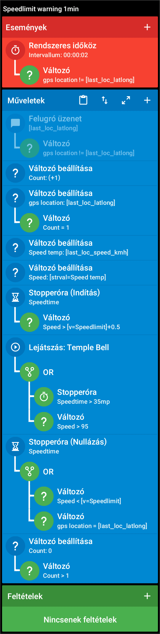 Speedtime nevű stopper létrehozásaA makro 2mp-ként végez ellenőrzést és amennyiben a Gps koordináta nem egyezik meg a rögzített koordinátával a makró a következőképpen hajtódik végre.