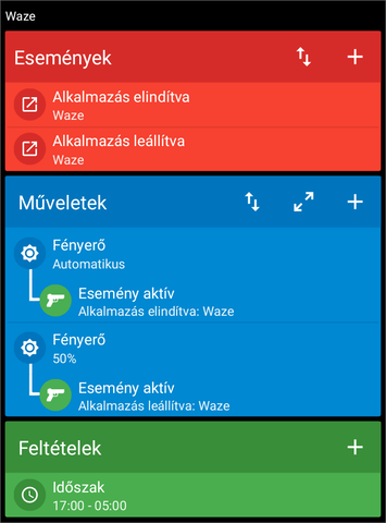 M: Fényerő automatikus (Minimum) - Feltétel: Esemény aktív (Alkalmazás elindítva Waze)