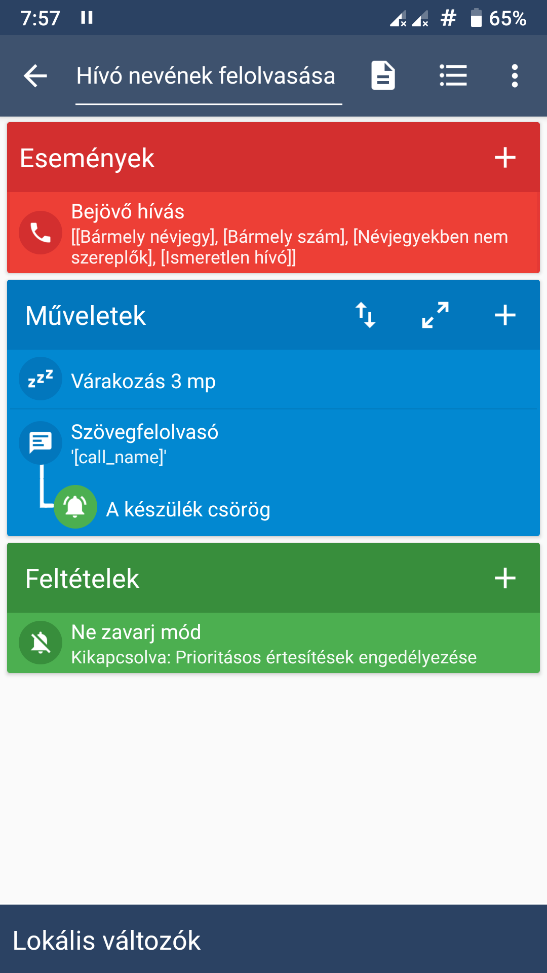 Illetve a Macrodroidnak engedélyeztem, hogy felülbírálhassa a "Ne zavarjanak" módot, mert híváskor ugye az alapból aktiválódik, és azért nem szólt a hang.
