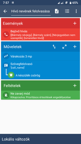 Ez Robotban is hátrány. Hiába teszem az esemény package kimenőjét globális változóba, az activity indítása műveletnél csak fixen kitöltött adatokat használhatok. Nem tudom a változó értékét beilleszteni az intent package rublikájába. Anno rákérdeztem, a Tasker tudja, tehát a lehetőség adott.