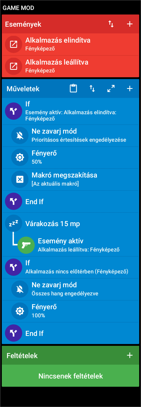 Nem véletlenül ajánlottam a Taskert. Sajnos, a Macrodroid nem tudja megkülönböztetni az elindult/leállt eseményt, a képernyőre került/háttérbe kerülttől. Neked az utóbbi kéne. Mellesleg, ez a Macro teljesen hibás. Nincs is művelet, amit végrehajtatna.