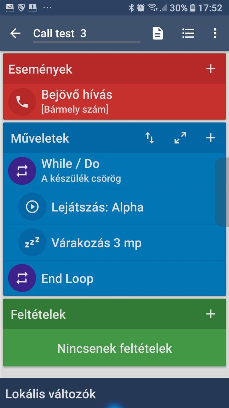 Bejövő híváskor a csengőhang lejátszását pedig While/Do ismétléssel kell működtetni, ameddig a készülék csörög, különben egyszer az elején lefut és kész, hiába csörög a telefon tovább.