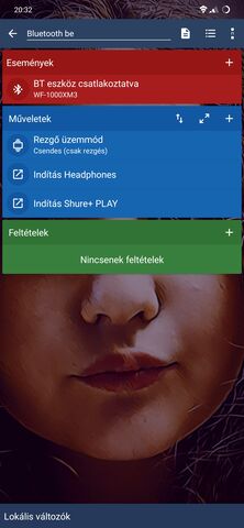 Az eseményekhez add hozzá az "Alkalmazás elindítva/bezárva - Alkalmazás leállítva- Headphones" eseményt. Ezután bökj rá az "Indítás Headphones" műveletre, Feltétel hozzáadása -> Esemény aktív > Bt csatlakoztatva.