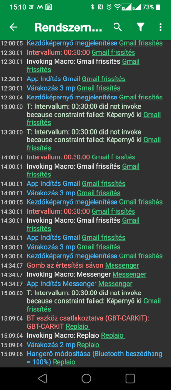 A makró röviden: ha csatlakozik a telefon BT-n egy Baseus BA01 nevű eszközhöz, és van megállított youtube zene, akkor folytassa, ha lecsatlakozik, álljon meg. Működött is szépen, annyit akartam módosítani, hogy ne csak ezzel az eszközzel legyen így, hanem egy VAGY kapcsolattal több eszközt is be tudjak rakni (fejhallgatót, másik BT hangszórót (3-at is), stb.), viszont nem találtam az Események között olyat, hogy VAGY, csak simán beraktam őket sorban egymás alá, de így (gondolom, mivel nem teljesül az összes) nem működik. Mindegy, gondoltam, majd máskor megcsinálom, ha több időm lesz, szóval visszacsináltam az eredetire, hogy csak a Baseus maradjon bent, viszont most meg nem működik. Ha csatlakozik, azt mutatja, hogy elindult a zene, mert a Play gomb helyett a Pause gombra vált, de mégsem szól, meg kell állítanom, majd újra rányomni, úgy már szól. Érdekes, mivel semmit nem állítottam át, minden úgy néz ki, ahogy eredetileg volt.