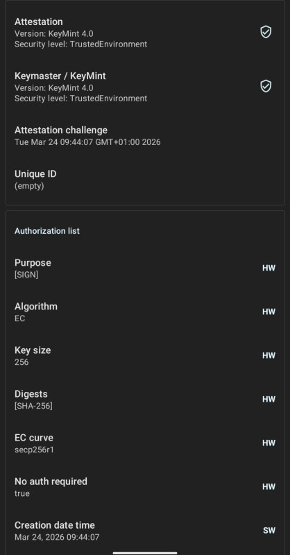 - csak az alkalmazas tesztelve (nem dobott ki): GrapheneOS, Google RKP, k6.1, rootless, bootloader sajat kulcsra visszazarva, BASIC integrity (nem vizsgal Play Integrity-t) -