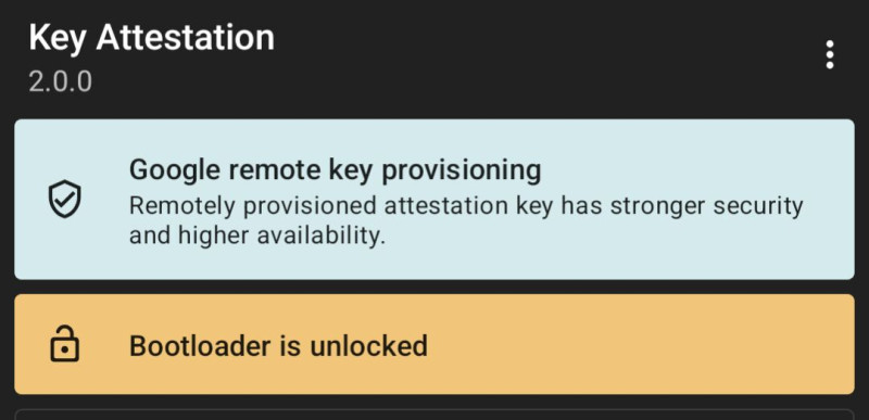 Valami megint történt mert a Telegramos keybox-ot megint bannolták. Tegnap még volt strong is, ma reggel már csak basic volt. Ráadásul eltűnt nekem a beállításokból a Google Play rendszerfrissítések opció és most a Play áruházban ismét a beállításokon belül érhető el a vásárlási igazolás (mondjuk ennek örülök), azt pár hónapja áthelyezték máshová. A régebbi keybox-al még van device integritym de ki tudja meddig.