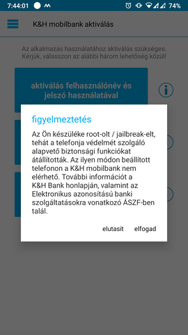 Ami plusz infó, maga a KH mobilbank alkalmazás elérhető a play áruházból, telepíthető, végig kell lapozni az elején vagy 5-6 oldalt, aztán feljön az, hogy aktiválja az alkalmazást, akármire nyomsz itt, fel fog ugrani, hogy a telefonod rootolt/jailberakelt.