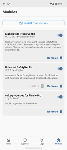 Köszi, magisk appok uninstall, novemberi ota, pixelfalsher, magisk modulok is benne, volte megy, legtöbb cucc megy. Wallet nem megy. Hideprops volt előzőleg a megoldás, a modulok között látom.