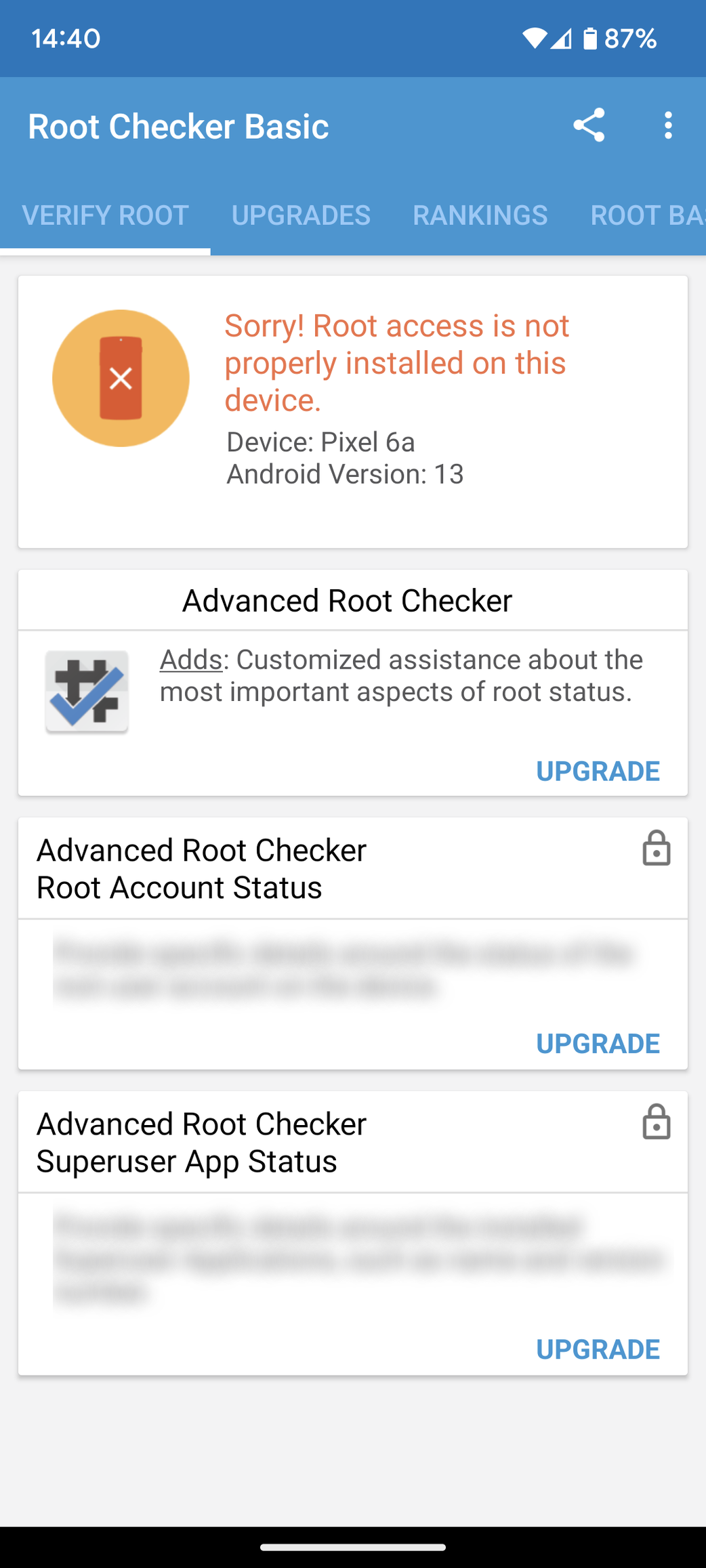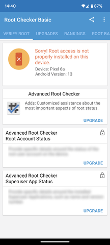 Otlet: szerintem elfelejtetted elrejteni a Magisk alkalmazast, legalabbis irni nem irtad, SafetyNet + Play Integrity azt mondod rendben es gyorsan megneztem neked, nalam siman fut. RootBeer-ek mit mondanak? Mert a Root Checker csak annyit csinal, hogy megnezi tud-e "normal modon" root-ot kerni (libsu hivassal).